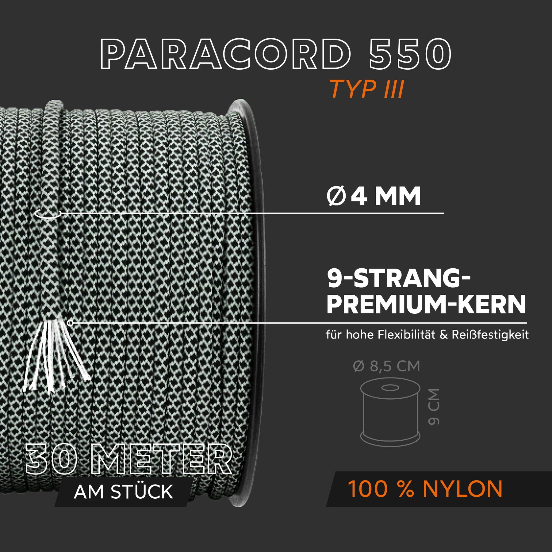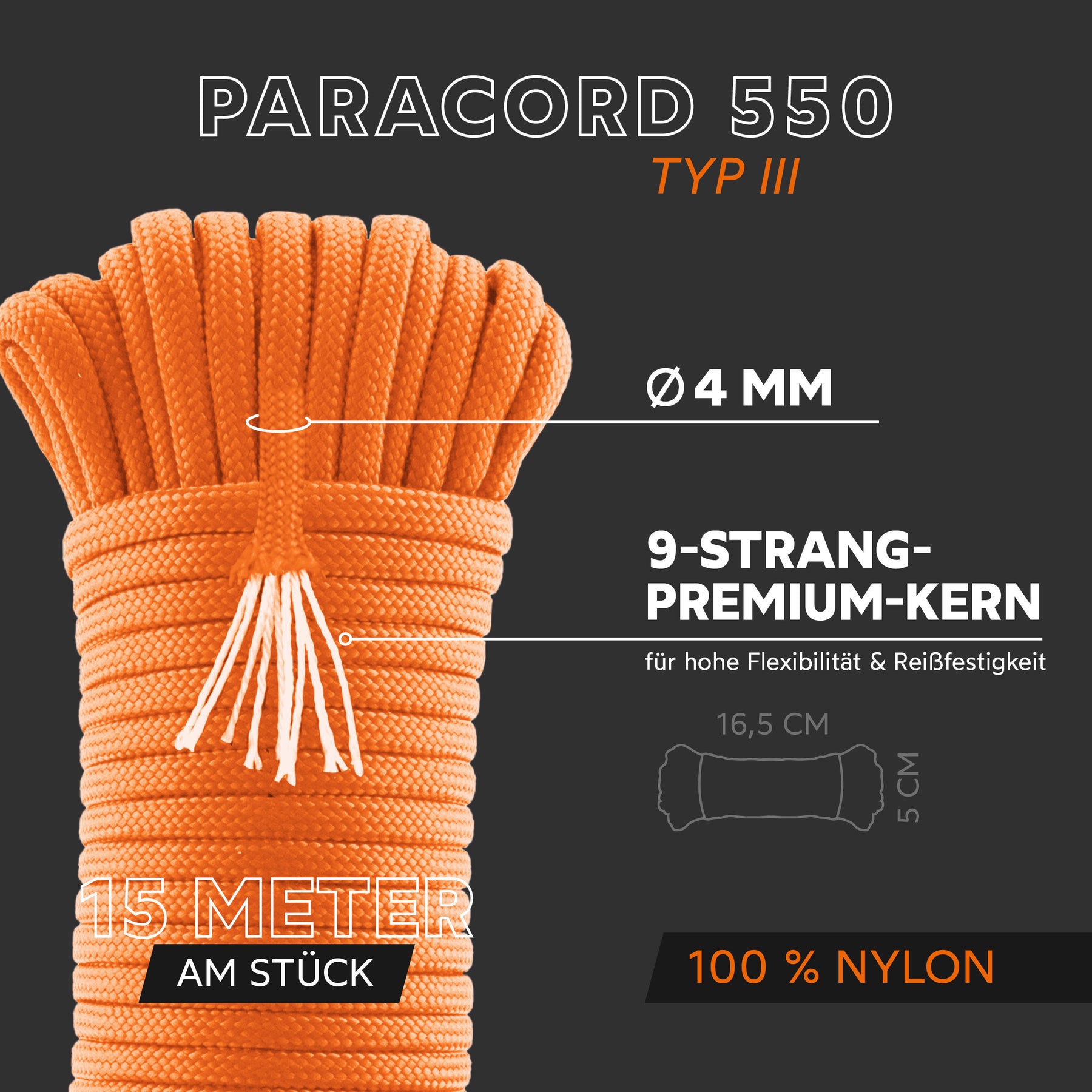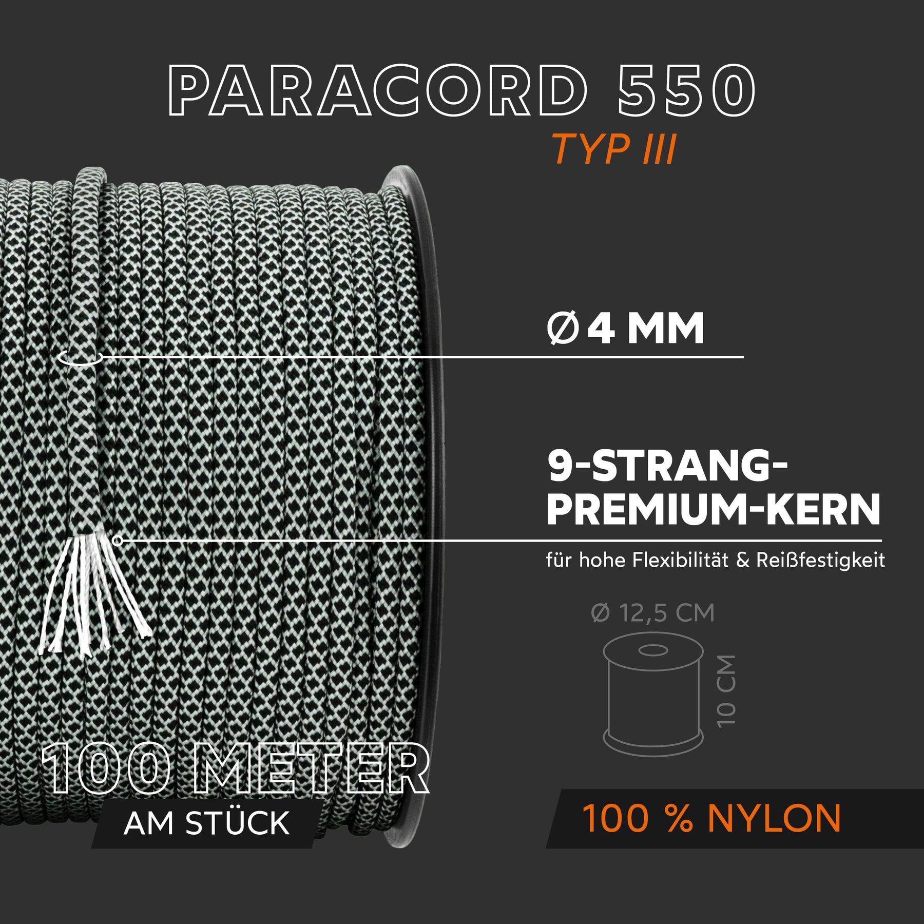 TECHNISCHE SPEZIFIKATIONEN & INHALT: Paracord 550 Typ III, Mil-Spec