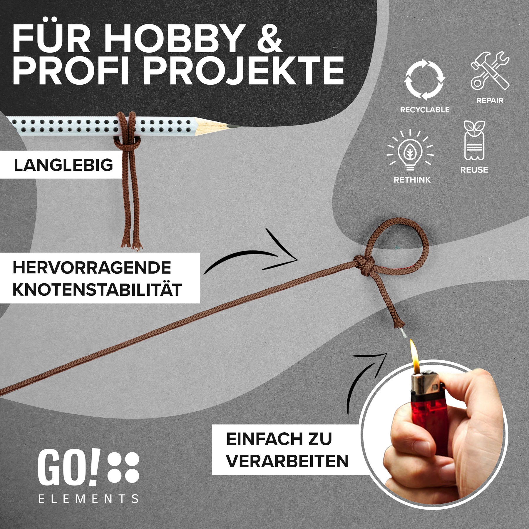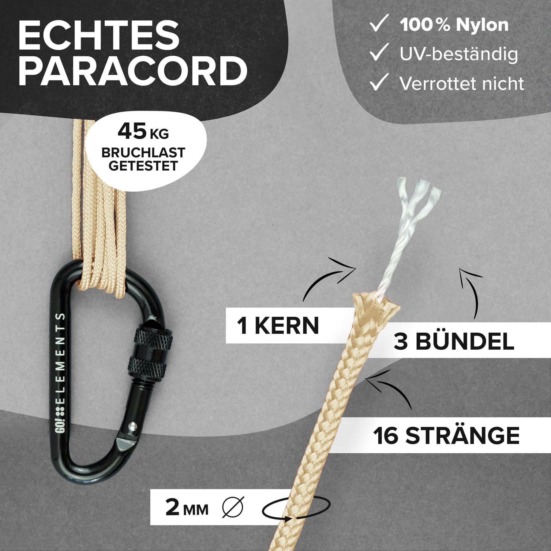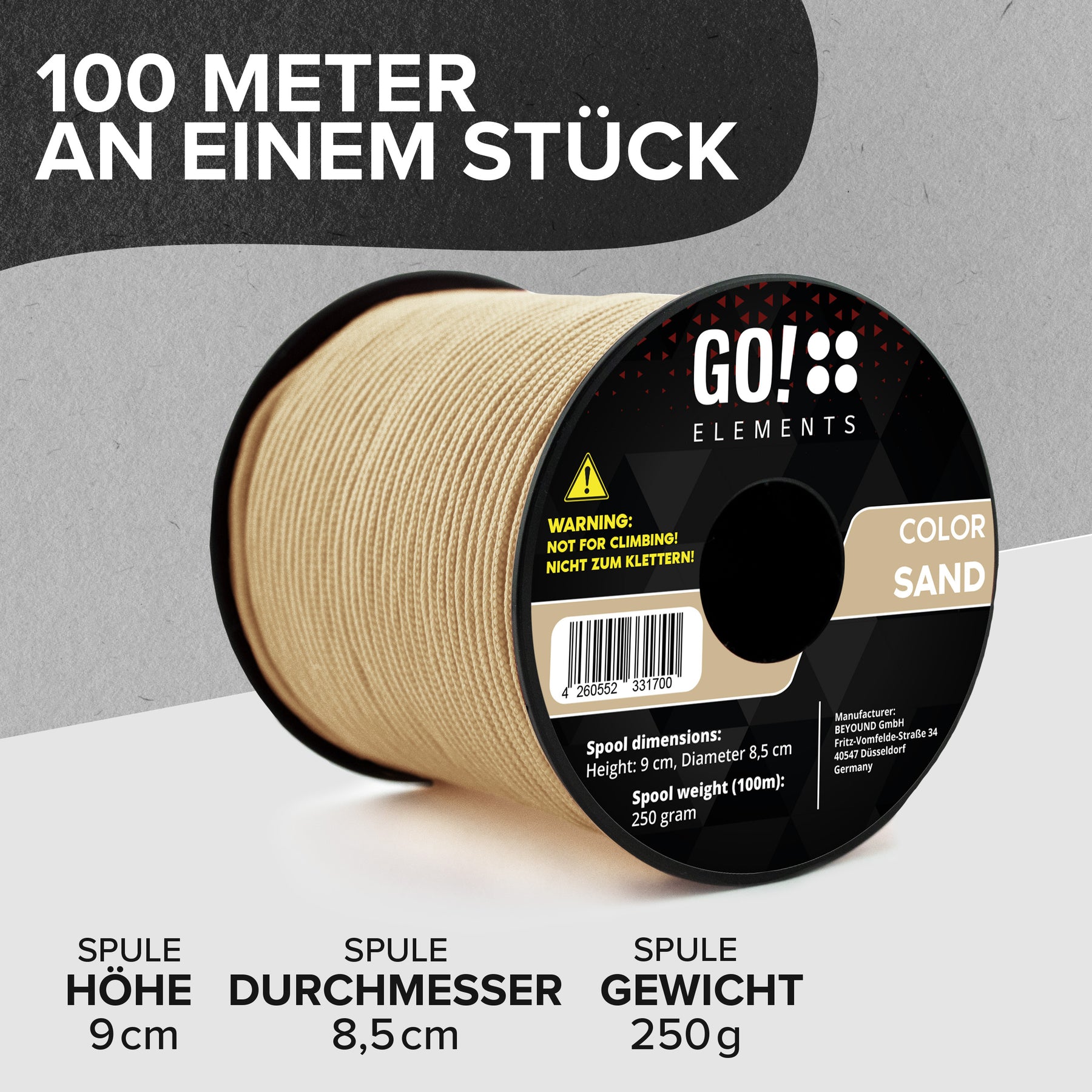 ALLZWECKSEILE von GO!elements - Unser Nylonseil ist perfekt für Outdoor und Indoor. Das Paracord 100 ist deutlich filigraner als z.B. Paracord 550 und hat eine hervorragende Bruchlast von 45kg.